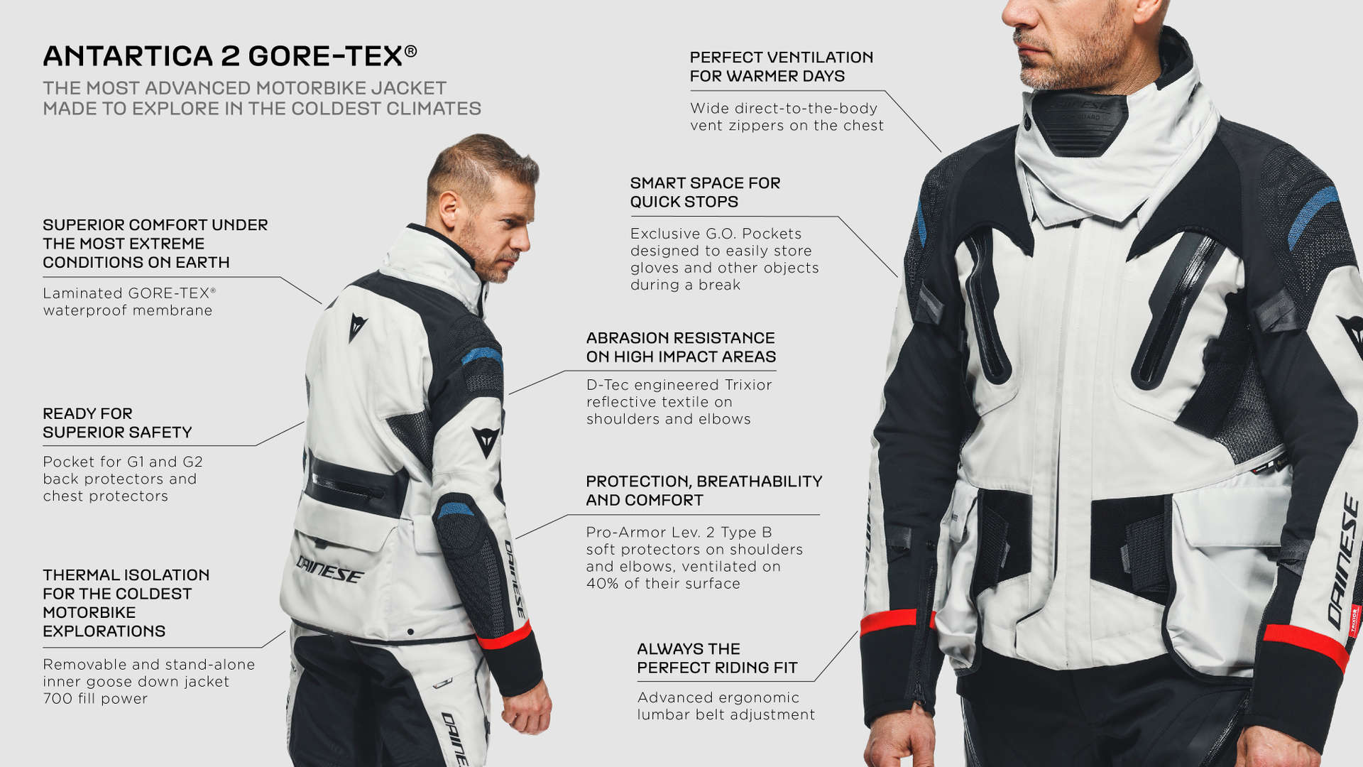 The Antarctica GORE-TEX® 2 jacket is the most advanced motorcycle touring garment, ideal when exploring the coldest lands on the planet. Designed to ensure superlative thermal insulation and greater protection in the most extreme conditions.